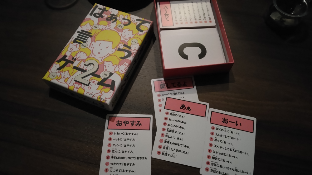 このゲームは、日本語教師であるCさんがご持参されました。仕事柄、日本語を習っている生徒さんが楽しく学べるゲームがあればと思い、購入されたとのことでした。「おおい」とか「ちょっと」という言葉を習う際、同じ言葉でもいろんな状況ごとに微妙な言い方の違いがあるため、そうした勉強のために役立つかもしれない、というお話でした。