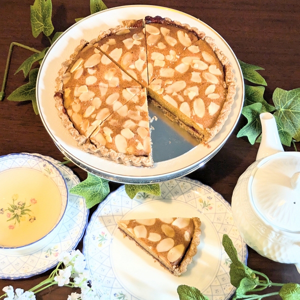 ジャムとアーモンドの華麗なハーモニー。ベイクウェルという町で、上に乗せるべきジャムを間違えて下に塗ってしまったら、それが美味しくて評判になったという一品です。